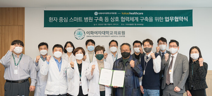 이화여자대학교 의료원(원장 유경하)이 19일 이대서울병원 C관 7층 부속회의실에서 카카오헬스케어(대표 황희)와 '환자중심 스마트 병원 구축 등 상호 협력체계 구축을 위한 업무협약‘을 맺었다.