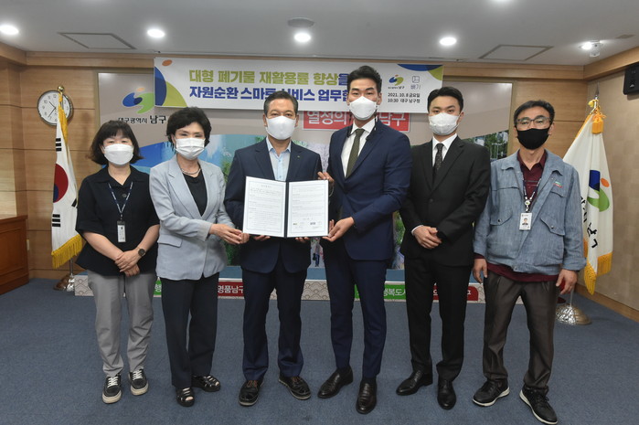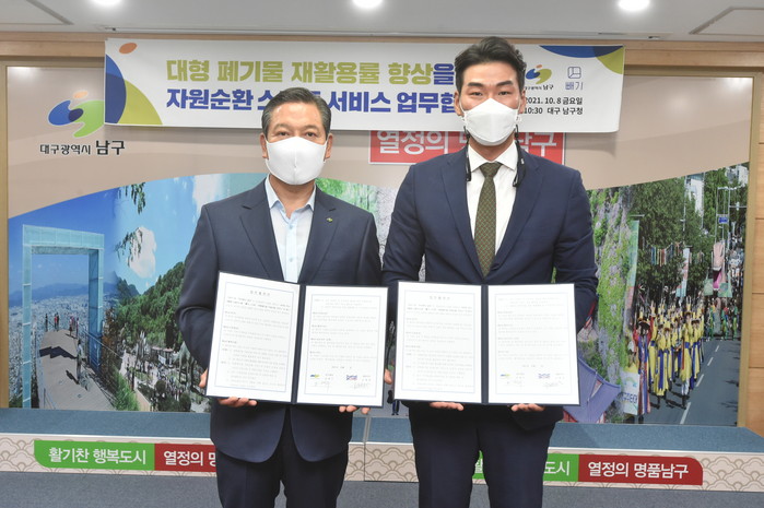 [로컬세계 박세환 기자]대구 남구청과 ㈜같다는 지난 8일 모바일 대형폐기물 수거신청 서비스 도입을 위한 업무협약을 체결하고, 대형폐기물 배출 신청과 처리 결과 확인을 모바일로 간편하게 확인할 수 있는 국내 최초 인공지능 대형폐기물 배출 서비스 앱 '빼기' 도입에 협력하기로 했다고 12일 밝혔다.