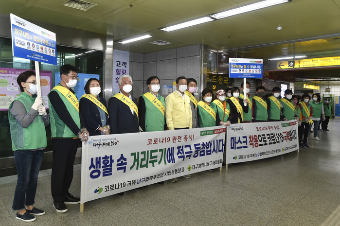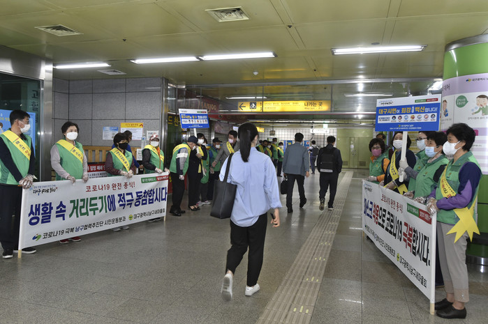 [로컬세계 박세환 기자]대구 남구는 19일 남구새마을회(코로나19 극복 남구협력추진단 시민운동분과)와 합동으로 코로나19의 확산 방지 및 완전한 종식을 위해 지하철 1호선 영대병원역 역사 내에서 ‘생활 속 거리두기’, ‘7대 기본생활수칙 지키기’ 홍보 캠페인을 실시했다.