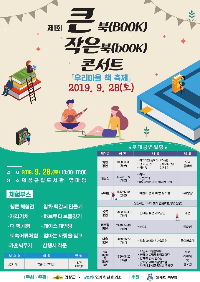 지역에서 처음으로 열리는 책관련 행사인‘큰북(BOOK_어른) 작은북(book_아이) 콘서트’는 책을 매개로 어른과 아이가 함께 어울려 독서문화를 확산시키자는 취지로 의성군과 안계청년회의소(JCI)가 공동 주관한다.