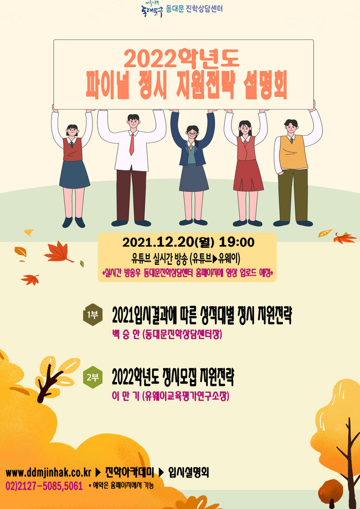 ‘2022학년도 파이널 정시 지원전략 설명회’는 20일부터 동대문진학상담센터 누리집과 동대문구청 유튜브 채널을 통해 누구나 시청 가능하며, 예약 시 자택으로 배치표 및 자료집도 미리 받아볼 수 있다. 예약은 동대문진학상담센터 누리집을 통해 가능하다.