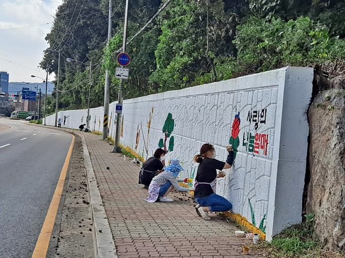 이번 벽화그리기에는 사랑의 나눔 열매 봉사단에서 주관해 120여m에 이르는 칙칙한 회색 콘크리트 옹벽에 3일간 학부모, 학생 등 70여 명의 봉사자들과 송정동 새마을협의회 회원들이 힘을 더하는 등 땀과 열정을 불어 넣어 한 폭의 아름다운 그림으로 완성했다.
