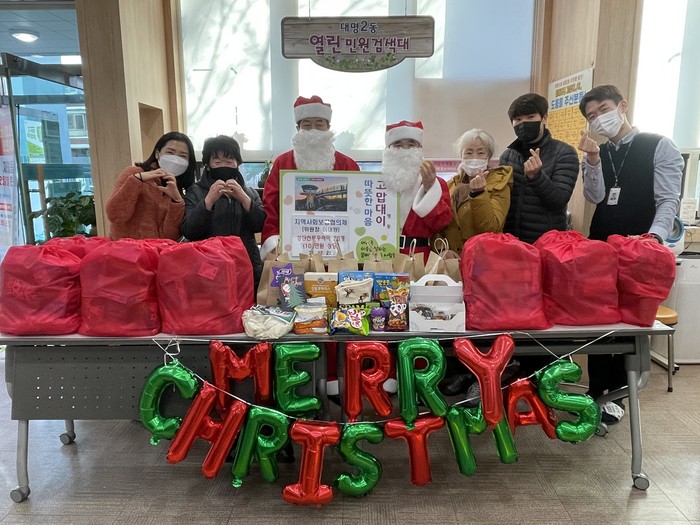[로컬세계 박세환 기자]대구 남구 대명2동 지역사회보장협의체(위원장 이대원)는 22일부터 23일까지 양일간 크리스마스를 맞아 코로나19로 우울한 지역의 어린이에게 성탄 선물꾸러미를 전달하는 “메리~ 크리스마스 산타대2” 사업을 펼쳤다.
