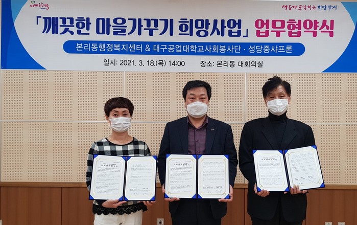 [로컬세계 박세환 기자]대구 달서구 본리동(동장 석준언)은 19일 대구공업대학교 사회봉사단 및 성당중학교 봉사동아리와 '깨끗한 마을 가꾸기 희망사업' 업무협약을 체결했다.