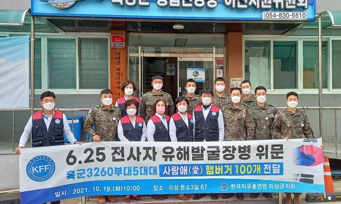 [로컬세계 박상진 기자]한국자유총연맹의성군지회(회장 김영식)는 지난 19일 6.25 전사자 유해발굴 작업에 참여하고 있는 장병을 위문하기 위해 의성군 예비군지역대를 방문해 위문품을 전달했다고 20일 밝혔다.