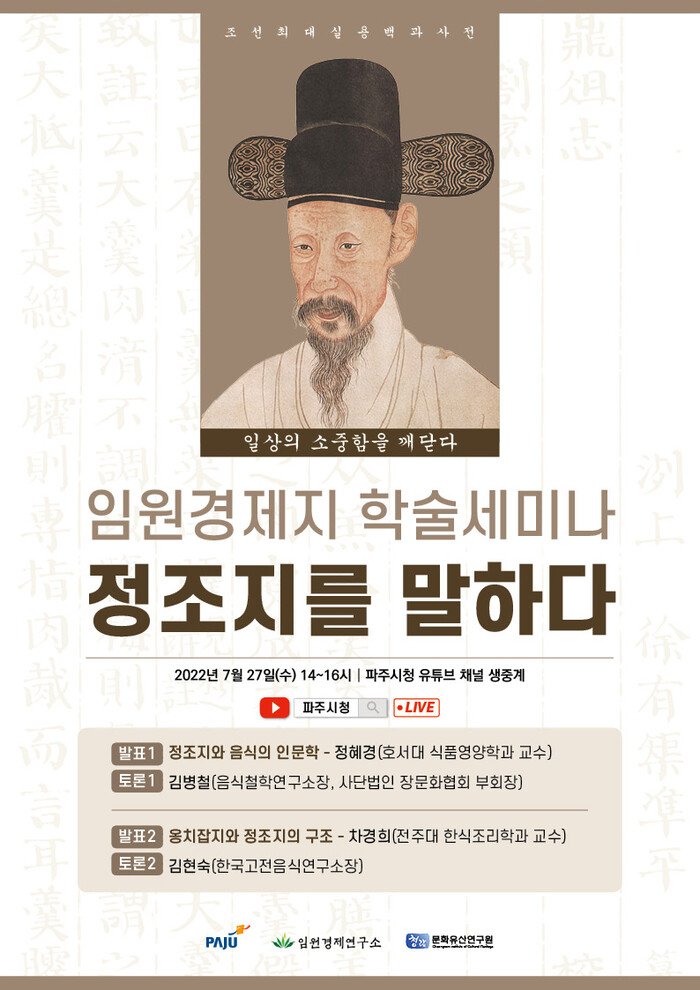 [로컬세계 = 이영원 기자]경기 파주시(시장 김경일)는 오는 27일 오후 2시 파주시청 공식 유튜브 채널에서 생중계로 2022 임원경제지 학술세미나-‘정조지를 말하다’를 개최한다고 20일 밝혔다.
