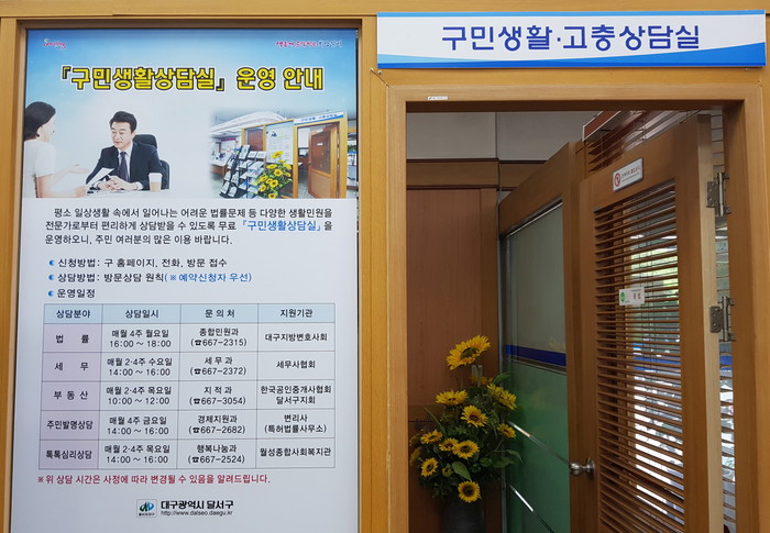 달서구 구민생활상담실은 구청 1층 종합민원과 내에 설치돼 있으며, 구민들이 일상 속에서 생기는 법률, 세무, 부동산, 심리문제 등에 대해 전문가 무료상담을 지원한다.
