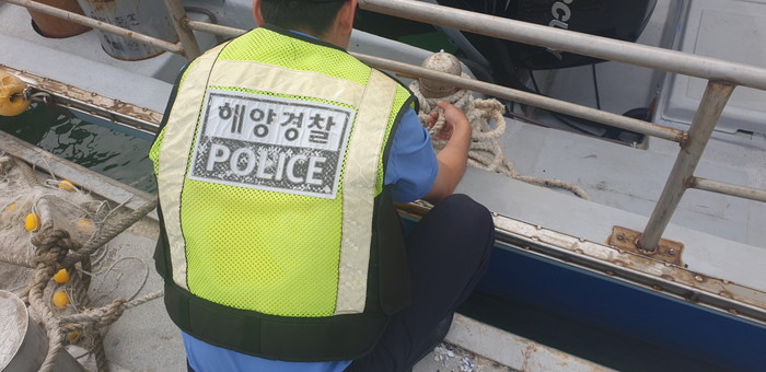 ▲군산해경이 제5호 태풍 다나스 대비 항구 정박 어선의 계류줄을 점검하고 있다. |