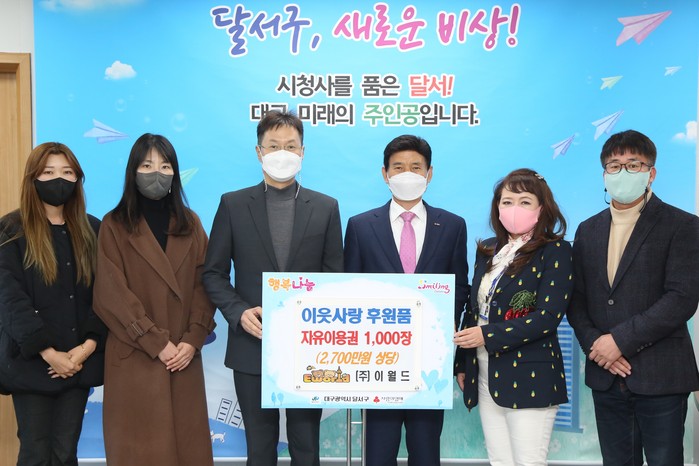 [로컬세계 박세환 기자]대구 달서구(구청장 이태훈)는 지난 8일 ㈜이월드(대표이사 방병순)에서 저소득 청소년 문화향유의 기회를 제공하기 위해 자유이용권 1,000장(2,700만원 상당)을 기탁받았다고 밝혔다.