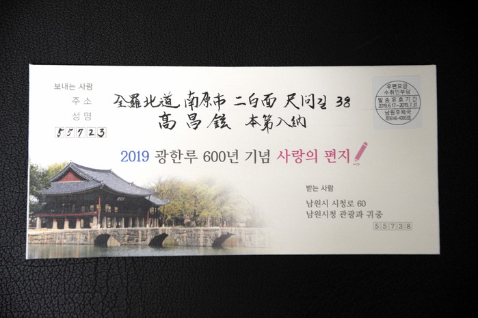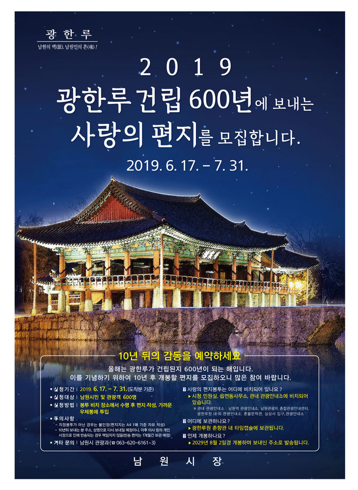 이환주 시장은 “사랑의 고장 남원에서 펼쳐지는 사랑의 편지 보내기 이벤트에 많은 사람들이 참여해 뜻깊은 추억을 만들기 바란다”며 “광한루 600년 기념행사를 알차게 준비해 남원관광의 품격을 드높이겠다”고 말했다.