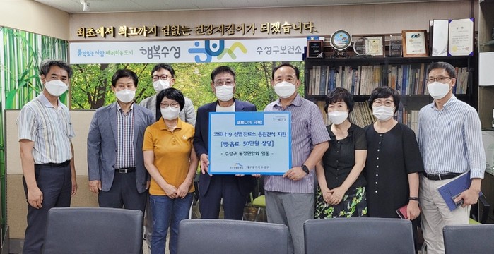 [로컬세계 박세환 기자]대구 수성구 통장연합회(회장 장진태)는 지난 13일 수성구보건소를 방문해 코로나19 확산 방지를 위해 애쓰는 선별진료소 근무자들에게 빵과 음료 등 간식(50만 원 상당)을 전달했다고 17일 밝혔다.
