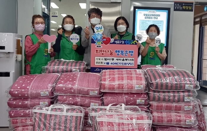 [로컬세계=박세환 기자] 대구 수성구 범어1동 새마을부녀회(회장 송미화)는 지난 23일 추석을 맞아 취약계층에게 전달해 달라며 이불 40채(77만원 상당)를 범어1동 행정복지센터에 기탁했다.
