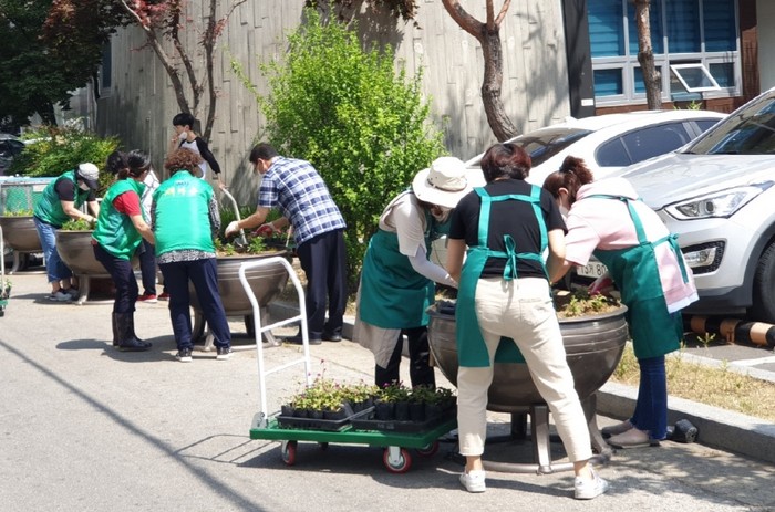 새마을부녀회 회원들은 매 계절마다 도시미관 개선을 위해 지속적으로 동천동 관내 주요거리에 꽃 화단 및 화분을 조성하고 계절 꽃을 심고 있다.