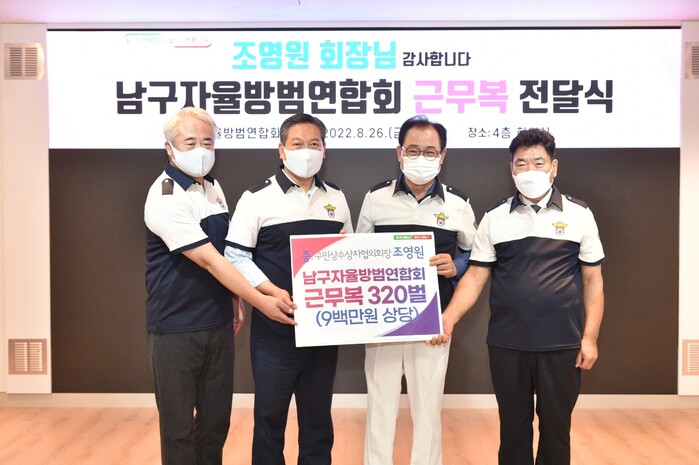 조영원 회장은 “남구의 치안을 위해 활발한 활동을 하고 있는 자율방범연합회원들을 위해 조금이나마 보탬을 주고자 근무복을 후원하게 되었고, 앞으로도 더욱 살기좋은 남구를 위해 힘써 줄 것”을 당부했다.