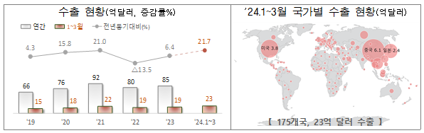 국가별로 보면 수출 1위 중국 의존도는 낮아지고 다양한 나라로 수출이 늘면서 올해 수출한 175개국(동기간 역대최다) 중 110개국이 최대실적을 기록했다.
