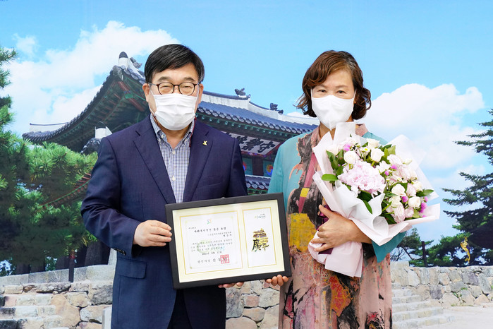| ▲지난 11일 신동헌 시장(왼쪽)이 최순자씨에게 유공자 표창을 수여하고 기념촬영을 하고 있다. 광주시 제공 |