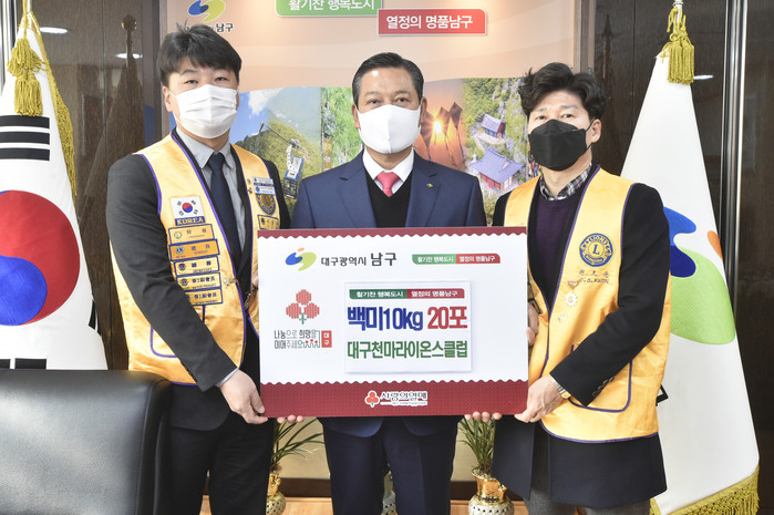 대구 남구청(구청장 조재구)은 지난 8일, 대구천마라이온스클럽(회장 이상수)에서 어려운 이웃을 위해 백미10kg 20포를 전달했다고 밝혔다. 이날 전달된 백미는 지역 내 생활이 어려운 주민 등에 전해질 예정이다.(사진=대구 남구청 제공)