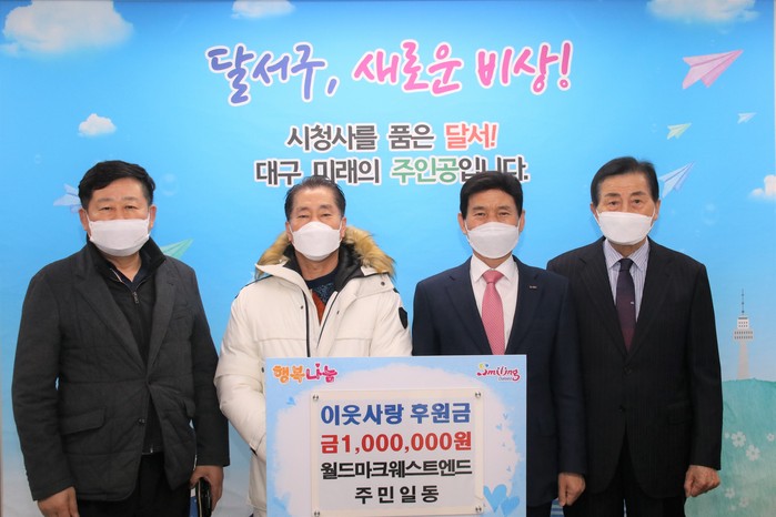 [로컬세계 박세환 기자]대구 달서구는 지난 24일 대우월드마크웨스트엔드(감삼동) 주민일동으로부터 관내 어려운 이웃들에게 지원해달라며, 후원금 100만원을 기탁 받았다고 26일 밝혔다.