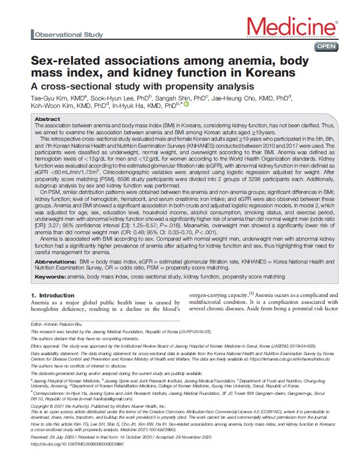 ▲‘Medicine’ 2021년 1월호에 게재된 해당 연구 논문 「“Sex-related associations among anemia, body mass index, and kidney function in Koreans: a cross-sectional study with propensity analysis”」 |