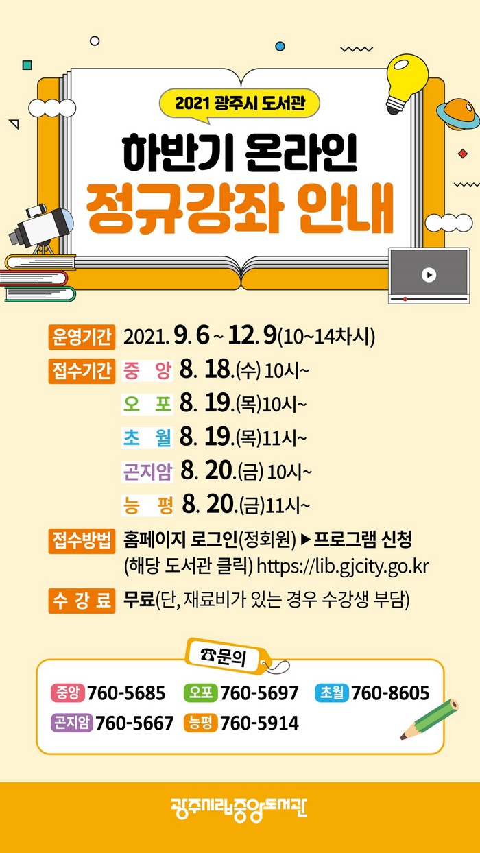 [로컬세계 김병민 기자]경기 광주시가 중앙도서관 등 5개 도서관에서 2021년도 하반기 정규강좌 41개 무료 강좌를 열어 오는 18일부터 수강생을 모집한다.