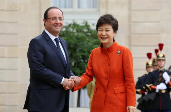 ▲ 박근혜 대통령이 지난 2013년 11월4일 오후(현지시간) 정상회담을 위해 엘리제궁에 도착, 프랑수아 올랑드 프랑스 대통령과 악수하고 있다.<사진출처=청와대 홈페이지> |