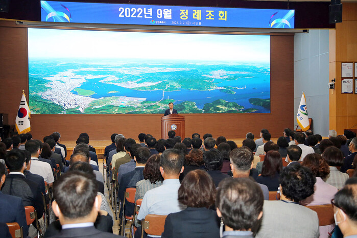 [로컬세계=권인진 기자]경남 창원특례시(시장 홍남표)는 2일 시청 시민홀에서 민선8기 첫 직원 정례조회를 개최하며 ‘동북아 중심도시 창원 실현’을 위해 전 직원들이 함께 노력해 줄 것을 당부했다.