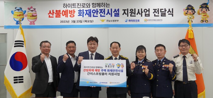 하이트진로는 지난 23일 전라남도 장흥군에 위치한 전남소방본부에서 산불방지예방 캠페인을 위한 물품 지원 전달식을 가졌다. 이날 행사에는 김현욱 하이트진로 호남권역장, 홍영근 전남소방본부장을 비롯한 관계자들이 참석했다.