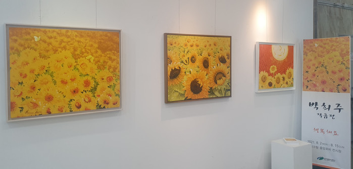 작가는 이번 전시에서 여름의 대표적인 꽃인 해바라기 작품을 선보인다. 주로 노란색과 초록색을 사용하여 해바라기의 생명력과 태양의 강렬함, 따뜻함을 표현한다. 해바라기 주위를 날아다니는 나비는 작품에 동적인 미를 더하여 단조로움을 덜어준다.