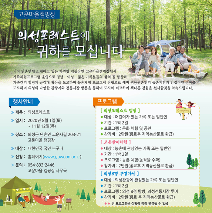 해당 사업은 의성군과 활기찬지역만들기협동조합이 함께 운영하며, 의성고운마을 캠핑장(의성군 단촌면 구계리 603번지)에서 실시한다.