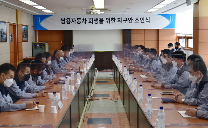 쌍용자동차는 기업회생의 염원이 담긴 자구안에 대한 조인식을 갖고 조속한 경영정상화를 위해 노사간 협력을 다졌다고 14일 밝혔다.