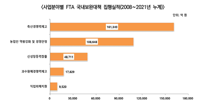 FTA 국내보완대책 성과평가 검토결과, 가장 많은 재정이 투입된 축산과 과수 분야의 규모화 및 시설현대화 관련 사업은 농가의 비용절감, 생산성 향상, 품질개선 등에 일정부분 기여한 것으로 평가된다고 했다.