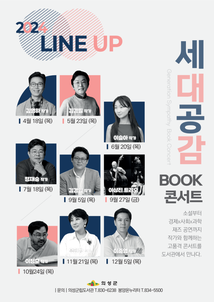 2024 '세대공감 BOOK 콘서트'는 매월 1일부터 강연 3일 전까지 신청할 수 있으며 해당도서관 방문 및 전화, 의성군 통합예약서비스를 통해 접수 가능하다.