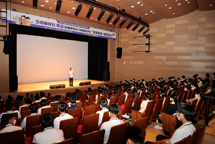 지난 13일에 개최 한 크리에이터 특강은 중·고등학생 300명(오전 4개교 150명, 오후 3개교 150명)을 대상으로 청소년들에게 인기 있는 인플루언서 유튜버 ‘디바 제시카’를 초청해 ‘유튜버로 살아남기’를 주제로 미디어 창작 직업군에 관련한 강의를 진행했다. 또 식전공연인 애플트리(채의진)의 연주와 노래도 함께 했다.