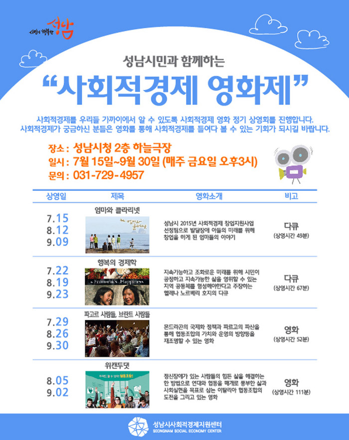 시는 시민들이 사회적경제와 협동조합에 관해 쉽고 재미있게 접근할 수 있도록 이번 영화제를 열게 됐다. 각 영화를 보려는 시민이나 단체는 시 사회적경제지원센터로 전화 신청하면 된다.