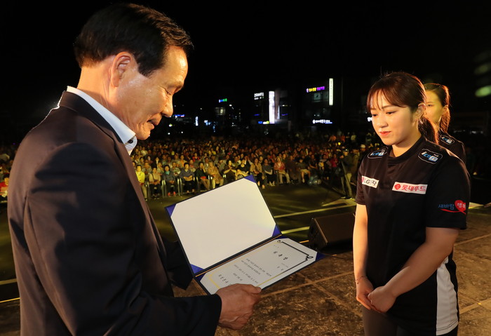 | ▲김주수 군수가 팀킴 김영미 선수에게 위촉장을 수여하고 있다. |