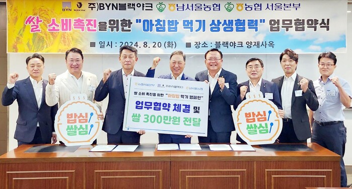 농협서울본부(본부장 김상수)와 남서울농협(조합장 안용승)은 쌀소비촉진을 위해 BYN블랙야크(회장 강태선)와 20일 서초구 양재동에 위치한 BYN블랙야크 양재사옥에서 쌀 소비촉진을 위한 “아침밥 먹기 상생협력” 업무협약을 체결했다.