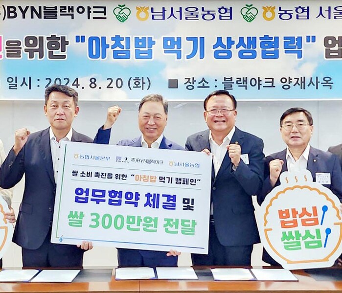 이날 협약을 통하여 농협 서울본부와 남서울농협은 쌀 소비촉진을 위해 BYN블랙야크에 300만원 상당의 농협쌀을 전달하고, BYN블랙야크는 농협으로 전달받은 쌀을 활용하여 쌀 나눔행사 및 임직원 아침밥 할인제공 등을 진행하며 지속적으로 농협쌀을 활용한 쌀 소비촉진 및 홍보를 적극 노력하기로 협약하였다.