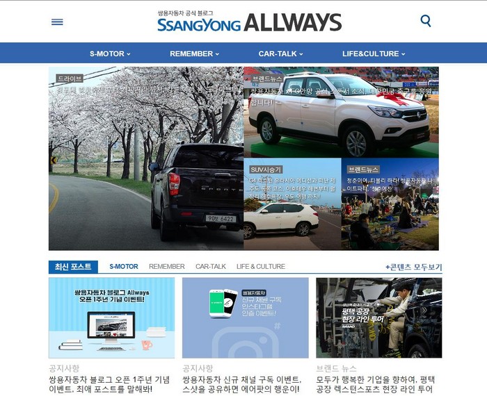 [로컬세계 길도원 기자]쌍용자동차(대표이사 최종식가 공식 블로그 ‘쌍용 ALLWAYS’ 오픈 1주년을 맞아 온라인 고객 편의성 제공 및 소통 강화를 위해 디자인 및 UI/UX를 전면 개편하고 이벤트를 실시한다고 3일 밝혔다.