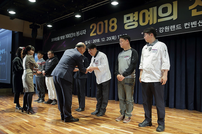 ▲지난 20일 하이원 그랜드호텔에서 열린 ‘2018 명예의 전당’ 행사에서 문태곤 대표이사가 우수봉사자들에게 축하를 전하고 있다.(강원랜드 제공) |