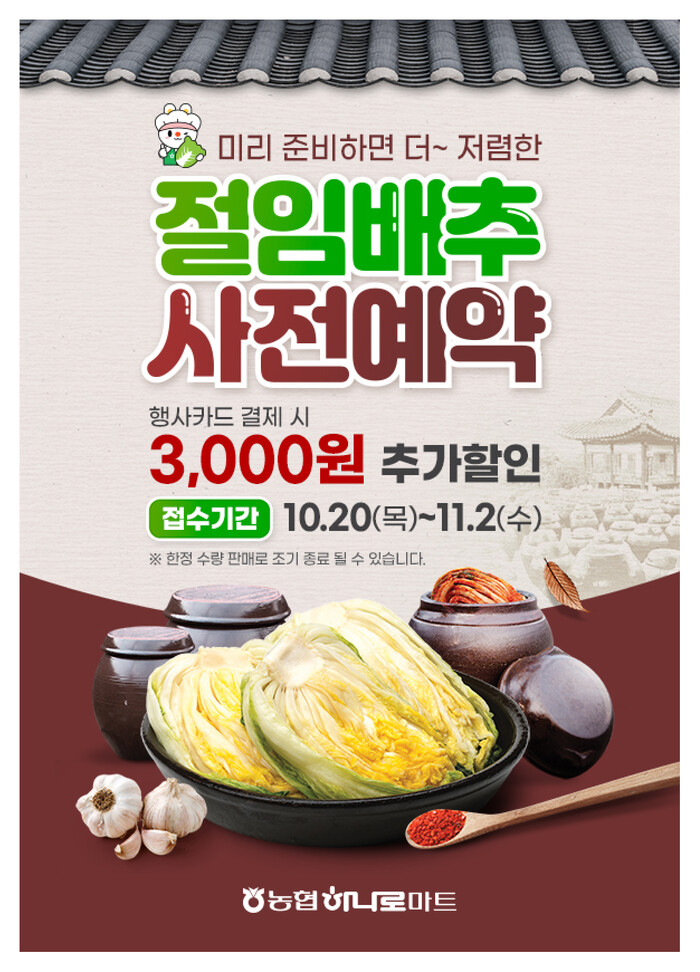 ▲ 농협하나로마트가 10월 20일부터 11월 2일까지 '절임배추 사전예약 할인판매'를 실시하고 국내산 고품질 절임배추를 최대 25% 할인 판매한다. 사전예약 기간 행사카드로 결제 시 10kg 박스당 3,000원 추가 할인혜택을 제공한다. |