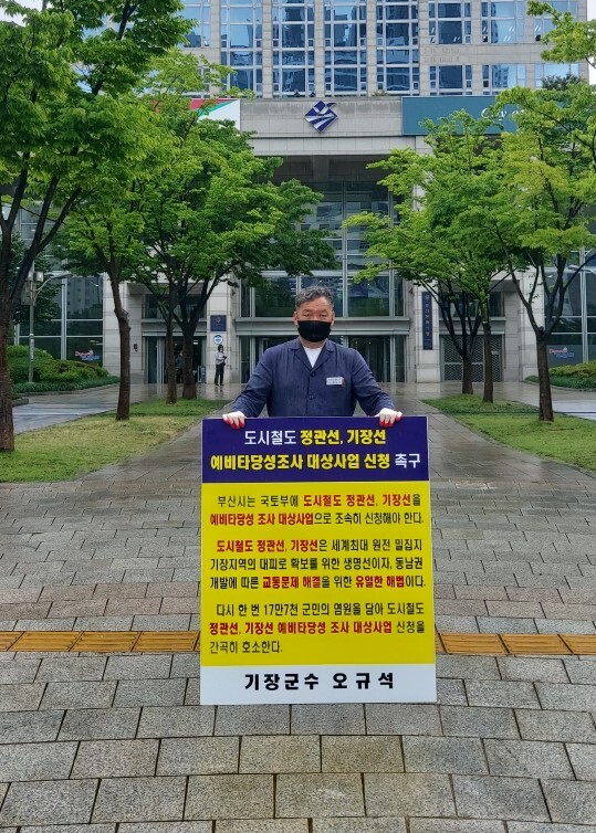[로컬세계 맹화찬 기자]오규석 기장군수는 지난 3일, 10일, 17일에 이어 24일에도 오전 10시 30분경 부산시청 앞에서 부산시가 ‘도시철도 정관선·기장선 사업’을 국토교통부 2022년 예비타당성조사 대상사업으로 조속히 신청하도록 강력히 요청하기 위해 1인 시위를 이어 나갔다.