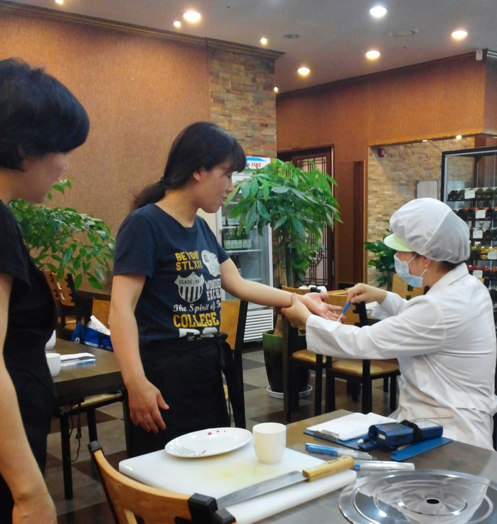 | ▲성남시 합동 점검반 관계자가 관내 음식점에서 조리종사자 손을 검사하고 있다. |