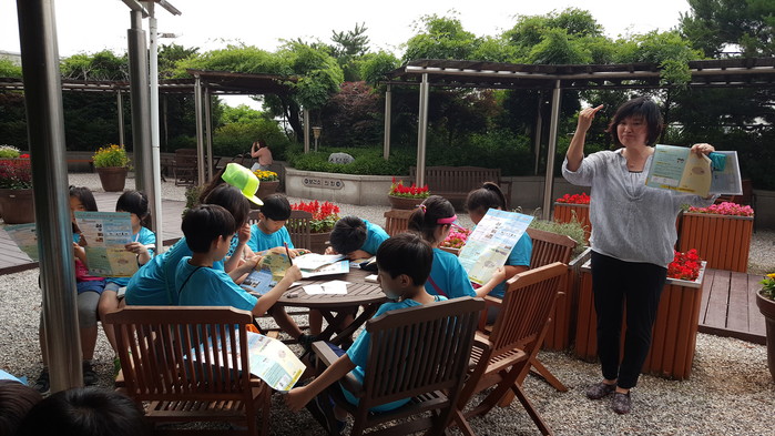 ▲동대문구 마을해설사가 초등학교 3학년 학생들에게 마을에 대한 설명을 하고 있다. |