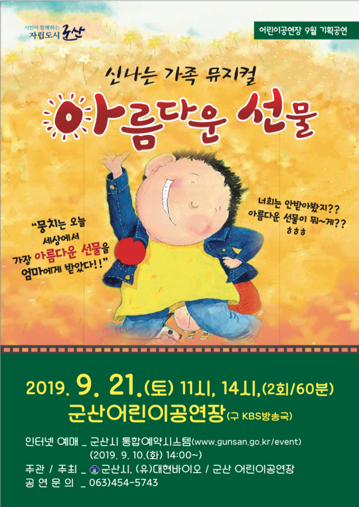 군산시는 가족뮤지컬 '아름다운 선물'을 오는 21일 오전 11시, 오후 2시, 2회에 걸쳐 군산어린이공연장에서 개최한다고 9일 밝혔다.