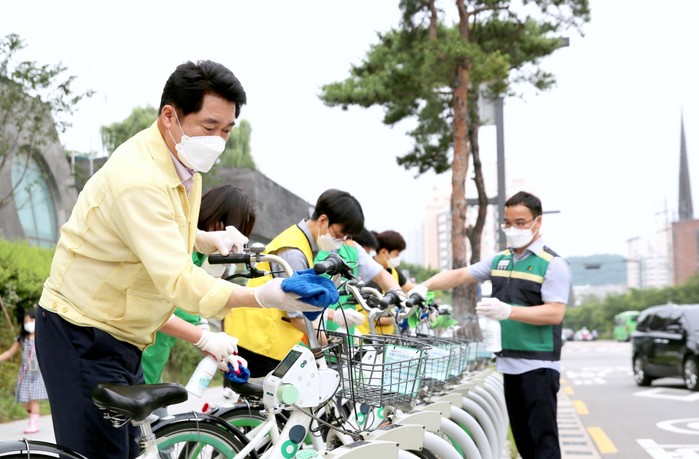 ▲박준희 구청장이 직원들과 함께 주민생활현장 방역활동을 실시하고 있다. 관악구 제공 |