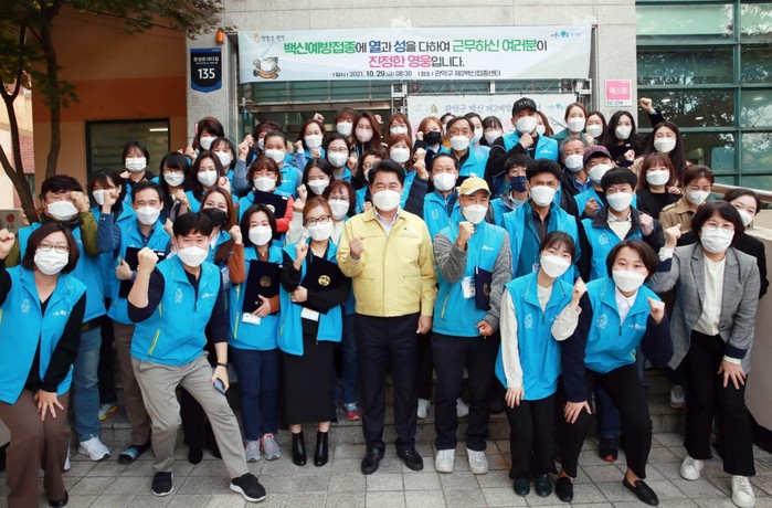 ▲지난해 코로나19 예방접종센터에서 근무자들과 박준희 구청장이 기념촬영을 하고 있다. |