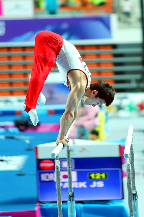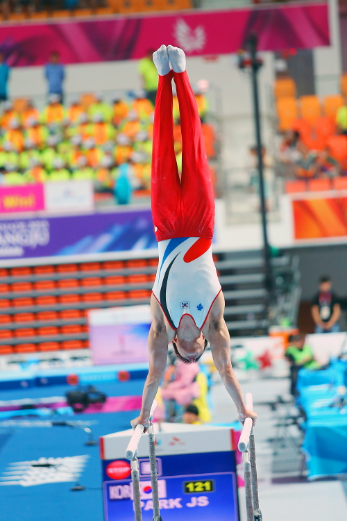 ▲ 한국 남자 기계체조 대표 조영광이 2015 광주하계유니버시아드대회 평행봉 결승에 출전해 연기를 펼치고 있다.<사진제공=KNS뉴스통신/이삼환 기자> |
