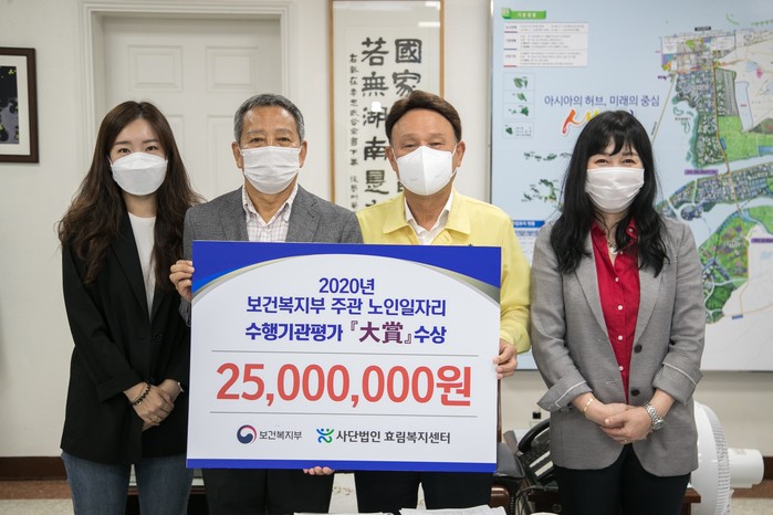 [로컬세계 양해수 기자]전북 군산시는 노인일자리 수행기관인 효림복지센터, 군산시니어클럽이 2020년 보건복지부 주관 전국 노인일자리 수행기관 평가에서 대상 및 최우수상을 수상했다고 13일 밝혔다.