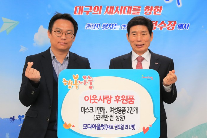 권일용 모다아울렛 대구지점장은 “대구지역에 코로나 감염 확진자가 대규모로 발생하면서 지역 사회의 확산 방지를 위해 구호물품 기부에 직원 모두가 뜻을 모으기로 했다”며 “이번 후원이 바이러스 감염에 취약한 소외계층 주민들에게 조금이나마 도움이 되길 바란다”고 말했다.