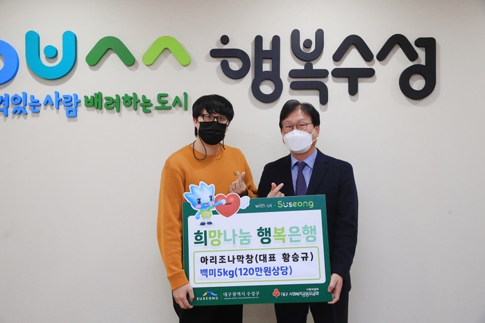 [로컬세계 박세환 기자]대구 수성구는 지난 27일 아리조나막창 황승규 대표가 시를 방문해 사회공헌 사업의 일환으로 백미 5kg 56포를 전달했다고 28일 밝혔다.
